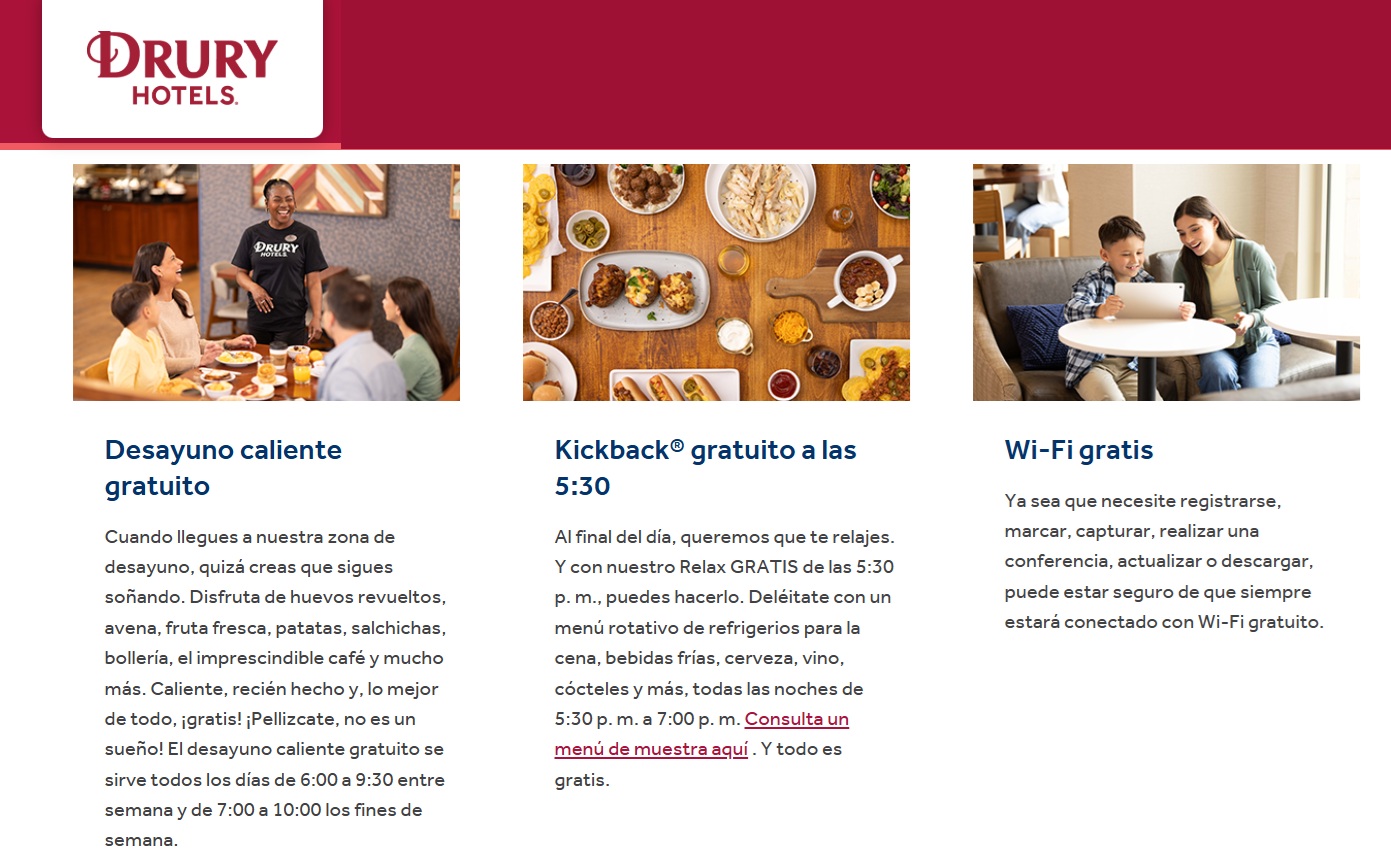 Drury Hotels ofrece diversas amenidades de primera clase sin costo adicional, para que puedas ahorrar y disfrutar de tu viaje. Disfrute de la libertad de viajar con las comodidades de Drury.