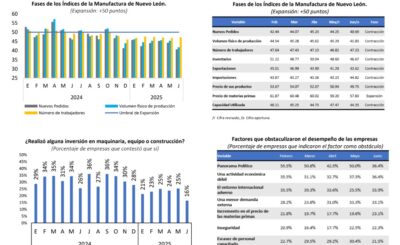 Pega panorama político y entorno internacional adverso a manufacturas: CAINTRA julio 22, 2025julio 22, 2025 Empresas MonterreyDestacado / Empresas *También el índice de “precios de sus productos” lleva a una tendencia a la baja desde inicios del año, a… Read More