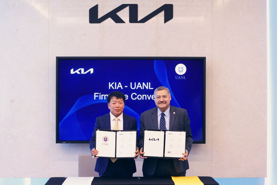 El Presidente de Kia México, Young Sam Kim y el Rector de la UANL, Santos Guzmán firmaron el Convenio de Colaboración durante una vista a la planta ubicada en Pesquería, Nuevo León.