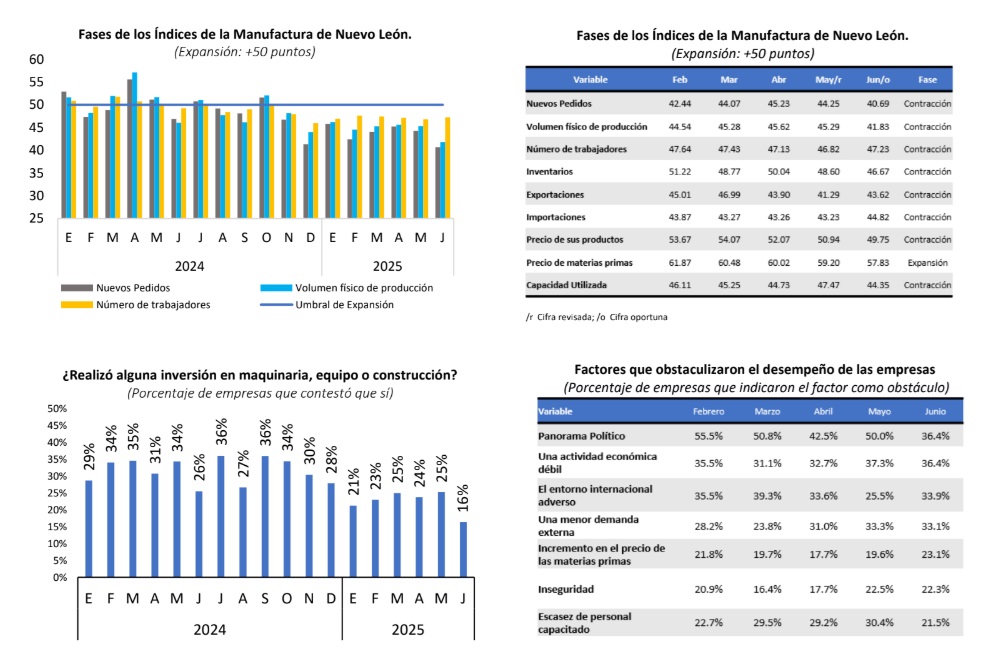 EMPRESAS MONTERREY.- Durante el mes de junio, la mayoría de los indicadores de la Encuesta de Expectativas Económicas de CAINTRA mostraron un retroceso respecto al mes anterior.
