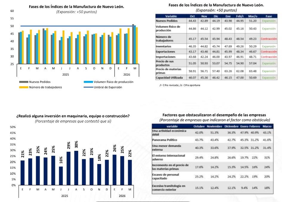 Al dar a conocer las Expectativas Económicas de la Manufactura en Nuevo León, Caintra, destacó que el indicador de “Nuevos pedidos” tuvo el mayor avance, donde repuntó 6.3 y pasó a zona de expansión.